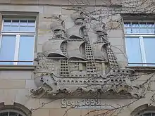A ship symbolising foreign trade on the outside of a colonial goods shop in Gotha (founded 1893)