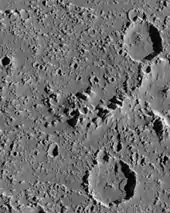 On a sub-kilometer scale the surface of Callisto is more degraded than the surfaces of other icy Galilean moons.[6] Typically there is a deficit of small impact craters with diameters less than 1 km as compared with, for instance, the dark plains on Ganymede.[12] Instead of small craters, the almost ubiquitous surface features are small knobs and pits.[6] The knobs are thought to represent remnants of crater rims degraded by an as-yet uncertain process.[13] The most likely candidate process is the slow sublimation of ice, which is enabled by a temperature of up to 165 K, reached at a subsolar point.[6] Such sublimation of water or other volatiles from the dirty ice that is the bedrock causes its decomposition. The non-ice remnants form debris avalanches descending from the slopes of the crater walls.[13] Such avalanches are often observed near and inside impact craters and termed "debris aprons".[6][12][13] Sometimes crater walls are cut by sinuous valley-like incisions called "gullies", which resemble certain Martian surface features.[6] In the ice sublimation hypothesis, the low-lying dark material is interpreted as a blanket of primarily non-ice debris, which originated from the degraded rims of craters and has covered a predominantly icy bedrock.