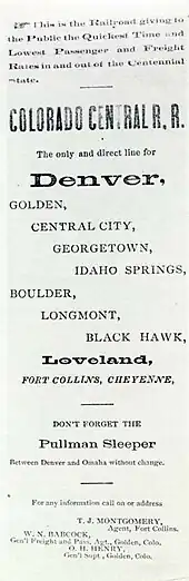 The Colorado Central Railroad was a U.S. railroad company that operated in Colorado and southeastern Wyoming in the late 19th century. It was founded in the Colorado Territory in the wake of the Colorado Gold Rush to ship gold from the mountains. It expanded from its Golden–Denver line to form a crucial link connecting Colorado with the transcontinental railroad and the national rail network. The history of the railroad throughout the 1870s was driven at times by a fierce struggle between local interests, led by W.A.H. Loveland, and outside investors of the Union Pacific Railroad led at times by Jay Gould. The early struggle of the company to build its lines was a major part of the early competition between Denver and Golden for supremacy as the principal metropolis of Colorado.