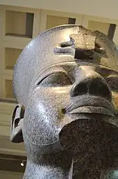 The colossal red granite statue of Amenhotep III is a granite head of the 18th Dynasty ancient Egyptian Pharaoh Amenhotep III. Dating from around 1370 BCE, it was found in the temple enclosure of Mut at Karnak in Upper Egypt. Two parts of the broken colossal statue are known: the head and an arm. Both parts are now in the British Museum.[1]