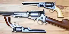 The Colt New Model revolving rifles were early repeating rifles produced by the Colt's Manufacturing Company from 1855 until 1864. The design was essentially similar to revolver type pistols, with a rotating cylinder that held five or six rounds in a variety of calibers from .36 to .64 inches.[1] They were mainly based upon the Colt Model 1855 Sidehammer Pocket Revolver developed by Elisha K. Root. Colt revolving pistols and rifles were attractive mainly because of their high rate of fire. They were used to a limited extent on the Pony Express, and made a brief appearance in the American Civil War.[2][3] However, the rifles were generally disliked by soldiers, and were ultimately discontinued due to serious design flaws.