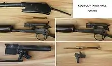 The Colt Lightning rifle or Colt Lightning carbine was a slide-action (pump-action) rifle manufactured by Colt from 1884 until 1904 and was originally chambered in .44-40 caliber.[1][2] Colt eventually made the Lightning Rifle in three different frame sizes, to accommodate a wide range of cartridges, from .22 Short caliber and .38-40 to .50-95 Express.[3] Its profile resembles the pump-action rimfire rifles made by the Winchester Repeating Arms Company and Remington Arms.[2] The Lightning saw use as a sporting arm in America and was adopted for use by the San Francisco Police Department, but was never as popular or as reliable as the various lever-action rifles of its day.[2]