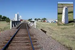 ![]() The railroad bridge that goes over Comanche Creek in Strasburg, Colorado. The inset shows a small monument in Strasburg's Lyons Park, located a few hundred feet from the creek, near the viaduct in the distance in the photo. | |