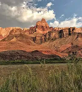 The summit of Comanche Point is composed of Kaibab Limestone overlaying cream-colored, cliff-forming, Permian Coconino Sandstone.[7] The sandstone, which is the third-youngest of the strata in the Grand Canyon, was deposited 265 million years ago as sand dunes. Below the Coconino Sandstone is slope-forming, Permian Hermit Formation, which in turn overlays the Pennsylvanian-Permian Supai Group. Further down are strata of Mississippian Redwall Limestone, and Cambrian Tonto Group.[8] Precipitation runoff from Comanche Point drains into the nearby Colorado River.