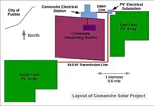 The Comanche Solar Project is a 120 megawatt (MWAC) photovoltaic power station near the city of Pueblo, Colorado. It became the largest solar facility in the state when it came online in late 2016. The electricity is being sold to Public Service of Colorado, a subsidiary of Xcel Energy, under a 25-year power purchase agreement (PPA). Xcel determined through an open bid process that the PPA's terms were competitive with natural gas.[1][2][3]