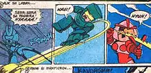 Upon landing, they saw the crashed ship and found Combatron, a fight broke out and Combatron gained the upper hand. The villain returned to their base, warning Combatron that their war isn't over and earth will be conquered.