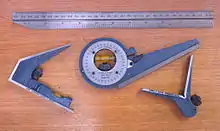 A combination square is a multi-purpose measuring and marking tool used in metalworking, woodworking, and stonemasonry. It is composed of a rule and one or more interchangeable heads that can be attached to the rule.[1][2] Other names for the tool include adjustable square, combo square, and sliding square.