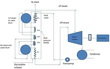 In order to remove the maximum amount of heat from the gasses exiting the high temperature cycle, a dual pressure boiler is often employed.[5] It has two water/steam drums. The low-pressure drum is connected to the low-pressure economizer or evaporator. The low-pressure steam is generated in the low temperature zone of the turbine exhaust gasses. The low-pressure steam is supplied to the low-temperature turbine. A super heater can be provided in the low-pressure circuit.