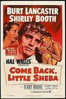 Come Back, Little Sheba is a 1952 American drama film directed by Daniel Mann in his directorial debut and produced by Paramount Pictures. The script was adapted by Ketti Frings from the 1950 play of the same title by William Inge. Starring Burt Lancaster, Shirley Booth, Terry Moore, and Richard Jaeckel, the film tells the story of a marriage between a recovering alcoholic and his frumpy wife, which is rocked when a young college student rents a room in the couple's house. The title refers to the wife's little dog that disappeared months before the story begins and whom she still openly grieves for. Booth, who had originated her role on Broadway and was making her film debut, won Best Actress honors at the Academy Awards, the Golden Globes, and the New York Film Critics Circle Awards.