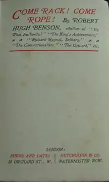 Come Rack! Come Rope! is a historical novel by the English priest and writer Robert Hugh Benson (1871–1914), a convert to Catholicism from Anglicanism. Set in Derbyshire at the time of the Elizabethan persecution of Catholics, when being or harbouring a priest was considered treason and was punishable with death, it tells the story of two young lovers who give up their chance of happiness together, choosing instead to face imprisonment and martyrdom, so that God's will may be done.