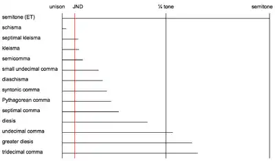 In the column below labeled "Difference between semitones", m2 is the minor second (diatonic semitone), A1 is the augmented unison (chromatic semitone), and S1, S2, S3, S4 are semitones as defined here. In the columns labeled "Interval 1" and "Interval 2", all intervals are presumed to be tuned in just intonation. Notice that the Pythagorean comma (PC) and the syntonic comma (SC) are basic intervals that can be used as yardsticks to define some of the other commas. For instance, the difference between them is a small comma called schisma. A schisma is not audible in many contexts, as its size is narrower than the smallest audible difference between tones (which is around six cents, also known as just-noticeable difference, or JND).