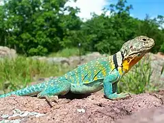 The common collared lizard (Crotaphytus collaris), also commonly called eastern collared lizard,[3] Oklahoma collared lizard, yellow-headed collared lizard, and collared lizard, is a North American species of lizard in the family Crotaphytidae. The common name "collared lizard" comes from the lizard's distinct coloration, which includes bands of black around the neck and shoulders that look like a collar. Males can be very colorful, with blue green bodies, yellow stripes on the tail and back, and yellow orange throats. There are five recognized subspecies.