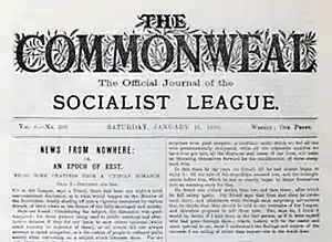 William Morris, founder of the League, was its chief writer, money finder and "responsible head". Edward Aveling was the sub-editor.[1] Before the last meeting of the Social Democratic Federation Morris and Aveling visited Frederick Engels to discuss their proposed paper. The first number appeared at the beginning of February 1885.John Turner, Ernest Belfort Bax and Eleanor Marx also regularly contributed articles. Its publishing office was at Great Queen Street, London. At first it appeared as a monthly (with supplements) from February, 1885 to May 1, 1886. It then commenced as a weekly. Aveling was unable to devote the necessary time on a weekly basis and Bax replaced him as sub-editor. As E. P. Thompson writes: "Almost every issue included at least one major contribution from Morris. During 1885 "The Pilgrims of Hope" appeared in monthly instalments: during 1886 and 1887 his series of articles with Bax, "Socialism from the Root Up", appeared side by side with "A Dream of John Ball"."[2] Aveling's "Lessons in Socialism", a series of lessons on Marx's "Das Kapital", that had not yet appeared in English translation, were published in nine instalments from April 1885 until March 1886.[3]