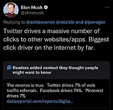 - ↑ Miller, Carl (November 20, 2022). "Elon Musk Embraces Twitter's Radical Fact-Checking Experiment". Wired. ISSN 1059-1028. Archived from the original on November 20, 2022. Retrieved November 24, 2023.