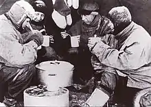 Apsley Cherry-Garrard in his analysis of the expedition estimated that even under optimistic assumptions the summit rations contained only a little more than half the calories actually required for the man-hauling of sledges.[4] A carefully planned 2006 re-enactment of both Amundsen's and Scott's travels, sponsored by the BBC, confirmed Cherry-Garrard's theory. The British team had to abort their tour due to the severe weight loss of all members.[25] The experts hinted that Scott's reports of unusually bad surfaces and weather conditions might in part have been due to their exhausted state which made them feel the sledge weights and the chill more severely.