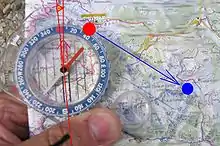 Compass navigation in conjunction with a map (terrain association) requires a different method. To take a map bearing or true bearing (a bearing taken in reference to true, not magnetic north) to a destination with a protractor compass, the edge of the compass is placed on the map so that it connects the current location with the desired destination (some sources recommend physically drawing a line). The orienting lines in the base of the compass dial are then rotated to align with actual or true north by aligning them with a marked line of longitude (or the vertical margin of the map), ignoring the compass needle entirely.[36] The resulting true bearing or map bearing may then be read at the degree indicator or direction-of-travel (DOT) line, which may be followed as an azimuth (course) to the destination. If a magnetic north bearing or compass bearing is desired, the compass must be adjusted by the amount of magnetic declination before using the bearing so that both map and compass are in agreement.[36] In the given example, the large mountain in the second photo was selected as the target destination on the map. Some compasses allow the scale to be adjusted to compensate for the local magnetic declination; if adjusted correctly, the compass will give the true bearing instead of the magnetic bearing.