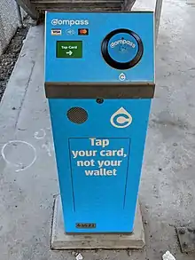 The Compass card is a contactless smart card automated fare collection system used primarily for public transit in Metro Vancouver, British Columbia, Canada. Compass card readers were first implemented as a beta in September 2013.[1] Due to delays, full implementation to the general public began in August 2015.[5][2] The system is operated by Cubic Transportation Systems and is managed by TransLink, the transportation authority for the region.[3]