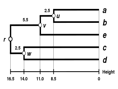 The dendrogram is now complete. It is ultrametric because all tips ( to ) are equidistant from :