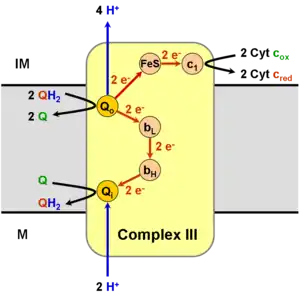 In the process called Q cycle,[6][7] two protons are consumed from the matrix (M), four protons are released into the inter membrane space (IM) and two electrons are passed to cytochrome c.