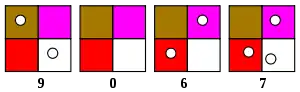 The Minicomputer is laid out as follows: a white square in the lower right corner with a value of 1, a red square in the lower-left with a value of 2, a purple square in the upper right with a value of 4, and a brown square in the upper left with a value of 8. Each Minicomputer is designed to represent a single decimal digit, and multiple Minicomputers can be used together to represent multiple-digit numbers. Each successive board's values are increased by a power of ten. For example, a second Minicomputer's squares – placed to the left of the first – will represent 10, 20, 40, and 80; a third, 100, 200, 400, and 800, and so on. Minicomputers to the right of a vertical bar (placed to the right of the first board, representing a decimal point) may be used to represent decimal numbers.