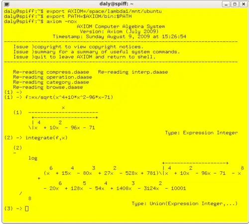 Symbolic integration of the algebraic function f(x) = x/x4 + 10x2 − 96x − 71 using the computer algebra system Axiom