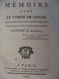 Jean-François Joseph Geffrard de La Motte, Comte de Sanois (1723-1799), was a French nobleman and army officer. In his later years his wife committed him unjustly to the Asylum of Charenton under a lettre de cachet, an incident which because it illustrated the despotic and arbitrary nature of the legal system of the ancien régime became a cause célèbre known as the Affaire Sanois on the eve of the Revolution, in the course of which the count also became increasingly well known for his many political pamphlets.