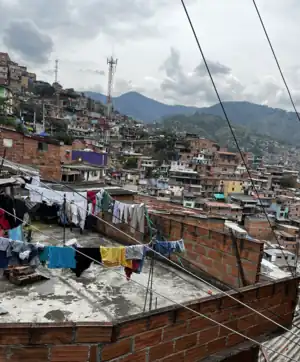 The commune is located to the west of the Central Western Zone of the city, bordered to the north by the Robledo commune, to the east by La América and Laureles-Estadio; to the south by the district of Altavista, and to the west by San Cristóbal and Altavista.[6] It is a neighborhood made up of houses that are typically made out of brick and cement, closely stacked together, and cling to the Andes mountains, sprawling throughout the west hills of the city.[5] Houses are painted vibrant colors but often left unfinished for various reasons such as tax loopholes and lack of resources to finish.[7]
