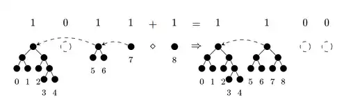 With these invariants, appending is isomorphic to binary number addition—two adjacent trees of the same height can be linked on constant time, with at most a logarithmic number of carry operations. This is illustrated in the following figure, where an element is being appended to a conc-tree that corresponds to a binary number 11: