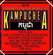 Concerts for the People of Kampuchea is a double album credited to Various Artists and released in March 1981.[3] It contains live performances by Wings, the Who, Queen, Elvis Costello, Pretenders, the Clash, the Specials and other artists from the Concerts for the People of Kampuchea, held at London's Hammersmith Odeon in December 1979 to raise money for the victims of war-torn Cambodia. The event was organised by Paul McCartney and Kurt Waldheim.