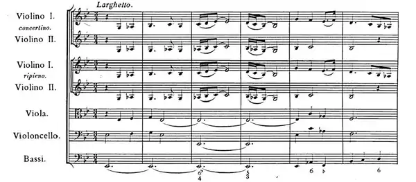 In the opening larghetto in E minor the full orchestra three times plays the ritornello, a sarabande of serious gravity. The three concertino responses veer towards the major key, but only transitorily. The dialogue is resolved with the full orchestra combining the music from the ritornello and the solo interludes.