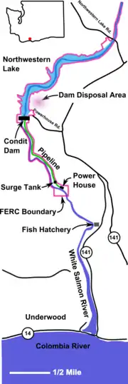 The facility consisted of Condit Dam 45°46′02″N 121°32′16″W / 45.76722°N 121.53778°W in Klickitat County, and its impoundment, Northwestern Lake; a woodstave pipeline that transported water to a surge tank and auxiliary spillway; two penstocks; and the powerhouse. Two horizontally mounted Francis turbines and generators produced electrical power, and the exhausted water rejoined the river about a mile downstream of the dam.