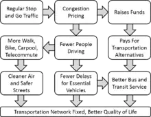 A survey of economic literature on the subject, however, finds that most economists agree that some form of road pricing to reduce congestion is economically viable, although there is disagreement on what form road pricing should take. Economists disagree over how to set tolls, how to cover common costs, what to do with any excess revenues, whether and how "losers" from tolling previously free roads should be compensated, and whether to privatize highways.[8] Also, concerns regarding fossil fuel supply and urban transport high emissions of greenhouse gases in the context of climate change have renewed interest in congestion pricing, as it is considered one of the demand-side mechanisms that may reduce oil consumption.[9][10][11][12]