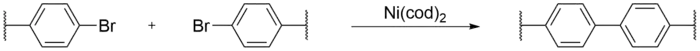 In Yamamoto coupling, carbon-carbon bonds of aryl halogenide compounds are formed via mediation from a transition metal catalyst, most commonly bis(cyclooctadiene)nickel(0), often written as Ni(cod)2. An advantage to Yamamoto coupling is only a single halogen functionalized monomer is required, leading to diversity in monomer species, as well as a simple reaction procedure. While most research in CMPs focus on controlling pore size and surface area, the lack of flexibility in the monomers used in Yamamoto couplings give way to free volumes and porosity in CMPs.[9] Only recently have controlled pore size and surface area CMPs via Yamamoto coupling been reported.[2] Ifzan et al also recently reported contra-prepositionally substituted [6]CMP using Yamamoto coupling reaction.[10]