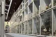 One of the most effective ways to prevent damage from occurring to taxidermy collections is to establish a monitoring system or procedure that routinely checks the condition of specimens.[7] When not on display, taxidermy specimens should be housed in well-sealed cabinets or cases. Metal cabinets may be made of aluminum and/or stainless steel with an epoxy powder coating and are effective at preventing pest and light damage. Wood cabinets can provide better protection from fluctuations in relative humidity, though they off-gas chemicals that may damage collections.[7] Though it is essential for cabinets and cases to be well-sealed, they should also allow for minimal airflow to prevent off-gassed chemicals or humidity from building up inside the container. For taxidermy specimens housed on open shelving, a polythene sheet can provide temporary protection from pollutants, though dust may accumulate electrostatically (2). Controlled lighting conditions with UV filters are important for reducing fading in taxidermy specimens.[13] Specimens should be regularly rotated in order to reduce light damage. 50–100 lux is the recommended light exposure for taxidermy, though some types of feathers are susceptible to damage at 50 lux.[7] The maximum annual exposure levels for biological specimens, feathers, fur, and leather is 180,000 lux hours.[4] In the span of one year, a taxidermy mount will fade half as much if displayed in low light compared to the same conditions in high light.[4] Ideal relative humidity conditions for taxidermy specimens are 40% minimum and 55% maximum.[7] An integrated pest management system is important to manage and monitor pests that can damage collections.