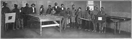 The coal company gave the YMCA free use of a building, valued at $20,000.[38] The YMCA had a reading room and library, gym, baths, kitchen, dining room, and a meeting hall available for use of labor unions and lodges.[39] The Buxton YMCA drew "the color line" and did "not allow white men in the membership," although they were "allowed to attend the entertainments, a privilege freely used."[40] The Buxton YMCA offered a variety of adult education programs, including literacy and hygiene classes, as well as a variety of public lectures. The YMCA also controlled the Opera House, keeping out "objectionable and immoral shows."[41]