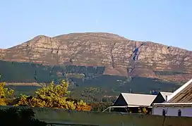 ![]() Constantiaberg from the east. Just visible at the summit is the radio mast. Elephant's Eye cave appears as a black dot on the left. Note the ancient, slightly tilted strata of the sandstones of the Table Mountain Group. | |