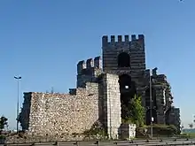 The Gate of the Spring or Pēgē Gate (Πύλη τῆς Πηγῆς in Greek) was named after a popular monastery outside the Walls, the Zōodochos Pēgē ("Life-giving Spring") in the modern suburb of Balıklı. Its modern Turkish name, Gate of Selymbria (Tr. Silivri Kapısı or Silivrikapı, Gk. Πύλη τῆς Συλημβρίας), appeared in Byzantine sources shortly before 1453.[94] It lies between the heptagonal towers 35 and 36, which were extensively rebuilt in later Byzantine times: its southern tower bears an inscription dated to 1439 commemorating repairs carried out under John VIII Palaiologos. The gate arch was replaced in the Ottoman period. In addition, in 1998 a subterranean basement with 4th/5th century reliefs and tombs was discovered underneath the gate.[95]