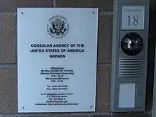 The Consular Agency of the United States in Bremen, also referred to as Consular Agency Bremen, was one of the American diplomatic missions to Germany until 2018. The unit offered limited services for U.S. citizens in areas including Bremen, Hamburg, Schleswig-Holstein, and Lower Saxony.[1] Despite that, services such as the issuing of visas or emergency passports were not provided, but can be obtained only from the U.S. Embassy in Berlin, the Consulate General in Frankfurt or Munich.[2]