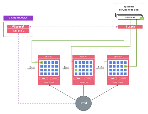 Container Linux also provides the fleet cluster manager, which controls Container Linux's separate systemd instances at the cluster level. As of 2017, "fleet" is no longer actively developed and is deprecated in favor of Kubernetes.[54] By using fleetd, Container Linux creates a distributed init system that ties together separate systemd instances and a cluster-wide etcd deployment;[50] internally, fleetd daemon communicates with local systemd instances over D-Bus, and with the etcd deployment through its exposed API. Using fleetd allows the deployment of single or multiple containers cluster-wide, with more advanced options including redundancy, failover, deployment to specific cluster members, dependencies between containers, and grouped deployment of containers. A command-line utility called fleetctl is used to configure and monitor this distributed init system;[55] internally, it communicates with the fleetd daemon using a JSON-based API on top of HTTP, which may also be used directly. When used locally on a cluster member, fleetctl communicates with the local fleetd instance over a Unix domain socket; when used from an external host, SSH tunneling is used with authentication provided through public SSH keys.[56][57][58][59][60]