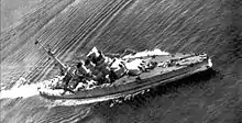 On the night of 11 November 1940, Conte di Cavour and Giulio Cesare were at anchor in Taranto harbor when they were attacked by 21 Fairey Swordfish torpedo bombers from the British aircraft carrier HMS Illustrious, along with several other warships. One torpedo exploded underneath 'B' turret at 23:15, and her captain requested tugboats to help ground the ship on a nearby 12-meter (39 ft) sandbank. His admiral vetoed the request until it was too late and Conte di Cavour had to use a deeper, 17-meter (56 ft), sandbank at 04:30 on 12 November. In an effort to lighten the ship, her guns and parts of her superstructure were removed and Conte di Cavour was refloated on 9 June 1941. Temporary repairs to enable the ship to reach Trieste for permanent repairs took until 22 December. Her guns were operable by September 1942, but replacing her entire electrical system took longer and she was still under repair when Italy surrendered a year later.[44] The Regia Marina made plans to replace her secondary and anti-aircraft weapons with a dozen 135-millimeter (5.3 in) dual-purpose guns in twin mounts, twelve 64-caliber 65-millimeter (2.6 in), and twenty-three 65-caliber 20 mm AA guns.[29] Her hulk was damaged in an air raid and capsized on 23 February 1945. Refloated shortly after the end of the war, Conte di Cavour was scrapped in 1946.[45]
