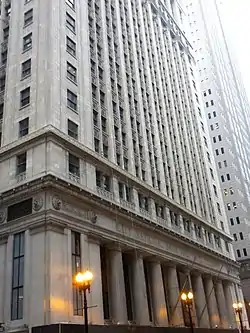 The Continental and Commercial National Bank is a historic office building located at 208 S. LaSalle Street in Chicago's Loop. The 21-story building was built in 1911-14 for the Continental and Commercial National Bank, at the time one of the largest banks in the nation. Architect Daniel Burnham designed the building in the Classical Revival style; Burnham, who was perhaps best known for his 1909 plan of Chicago, was a proponent of the style and used it in office buildings in multiple cities. The building's main entrance features a three-story colonnade with eight Doric columns; the eighteenth through the twentieth floors feature a matching colonnade, which forms the building's capital. A frieze and belt course separate the fourth and seventeenth floors from the shaft of the building, giving the building a small amount of horizontal emphasis. An open court occupies the center of the building, allowing natural light to reach its interior offices.[2]
