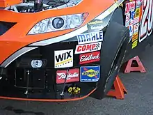 The best known example of a series with many contingency sponsorships was the NASCAR Cup Series. The front fenders of the cars were mottled with rectangular decals that teams are either required or financially encouraged to display.[1] Some of the more lucrative contingencies are the Busch Pole Award and the Sunoco Rookie of the Year Award.[1] In 2018, NASCAR moved away of contingency sponsorship stickers in the cars, instead granting such sponsors online sponsorship assets.[3]