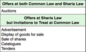 At common law, auctions, advertisements, displays of goods on shelves, tenders and the like are treated as mere invitations to create an offer. In contrast, Sharia law recognises these as valid offers (Ijab) which, upon being accepted (Qabul), will become binding by law upon the parties involved in the transaction.[15]