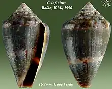 - 1 2 Conus infinitus Rolán, 1990. Retrieved through: World Register of Marine Species on 26 July 2011.