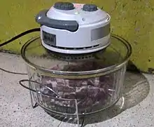 An air fryer is a small countertop convection oven designed to simulate deep frying without submerging the food in oil.[13][14] A fan circulates hot air[13] at a high speed, producing a crisp layer via browning reactions such as the Maillard reaction. Some product reviewers find that regular convection ovens or convection toaster ovens produce better results,[15][16][13] or say that air frying is essentially the same as convection baking.[17]