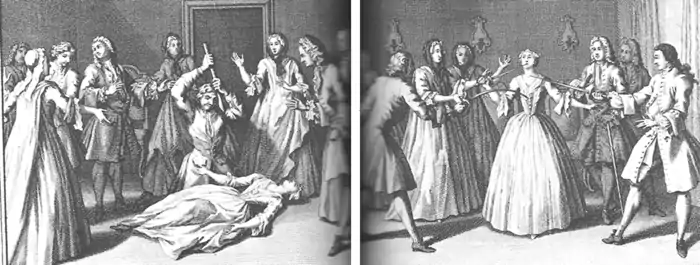 Countesses, duchesses, and members of the Parlement of Paris, including the President Charles-Robert Boutin, came to observe the miracles at Saint-Médard in 1731.[35] Certain members of the nobility did continue to attend private convulsionnaire meetings through the 1730s, including the brother of Voltaire.[36] By and large, however, the dominant element among the convulsionnaire movement appears to have been lower-class women who were "assisted" by the lower male clergy. Daniel Vidal's study of convulsionnaires found the majority (60%) to be women, of which the largest portion (43%) came from the lower classes. By contrast, men comprised 78% of those who assisted the convulsionnaires, and nearly half of those were members of the clergy.[37] Catherine Maire's study also made note of this predominance of male clergy.[38]