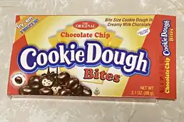 Cookie Dough Bites is an American candy owned by Taste of Nature, Inc.[1] With a cookie dough confectionery center, they are chocolate covered and most typically sold in theater-sized boxes.  Although launched as a chocolate-chip cookie dough flavor, since their introduction, there have been a variety of flavors released.  Originally launched in movie theaters in the US in 1997 they are now available in many areas of the world including Canada, the Caribbean, Mexico, UK, Europe/EU, several Middle Eastern countries, Australia and New Zealand