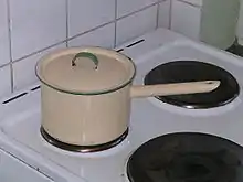 An induction cooktop involves the electrical heating of a cooking vessel by magnetic induction instead of by radiation or thermal conduction from an electrical heating element or from a flame. Because inductive heating directly heats the vessel, very rapid increases in temperature can be achieved and changes in heat settings are fast, similar to gas.[8]