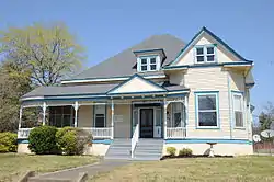 The Coolidge House is a historic house at 820 Perry Street in Helena, Arkansas. It is a 1+1⁄2-story wood-frame structure, built in 1880 by S. C. Moore as a wedding present for his daughter, Anna Leslie Moore, and Charles Coolidge, Jr. It is an excellent local example of Queen Anne styling, with numerous gables projecting from its steeply hipped and busy roof line. The porch extends partly across the front (south) before wrapping around to the west; it has sawn brackets and a spindled frieze, with a pedimented gable above the stairs.[2]