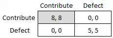 An assurance game describes the situation where neither player can offer a sufficient amount if they contribute alone, thus player 1 should defect from playing if player 2 defects. However, if Player 2 opts to contribute then player 1 should contribute also.[1] An assurance game is commonly referred to as a “stag hunt” (Fig.5), which represents the following scenario. Two hunters can choose to either hunt a stag together (which provides the most economically efficient outcome) or they can individually hunt a Rabbit. Hunting Stags is challenging and requires cooperation. If the two hunters do not cooperate the chances of success is minimal. Thus, the scenario where both hunters choose to coordinate will provide the most beneficial output for society. A common problem associated with the stag hunt is the amount of trust required to achieve this output.[2] Fig. 5 shows a situation in which both players (hunters) can benefit if they cooperate (hunting a stag). As you can see, cooperation might fail, because each hunter has an alternative which is safer because it does not require cooperation to succeed (hunting a hare). This example of the potential conflict between safety and social cooperation is originally due to Jean-Jacques Rousseau.[3]